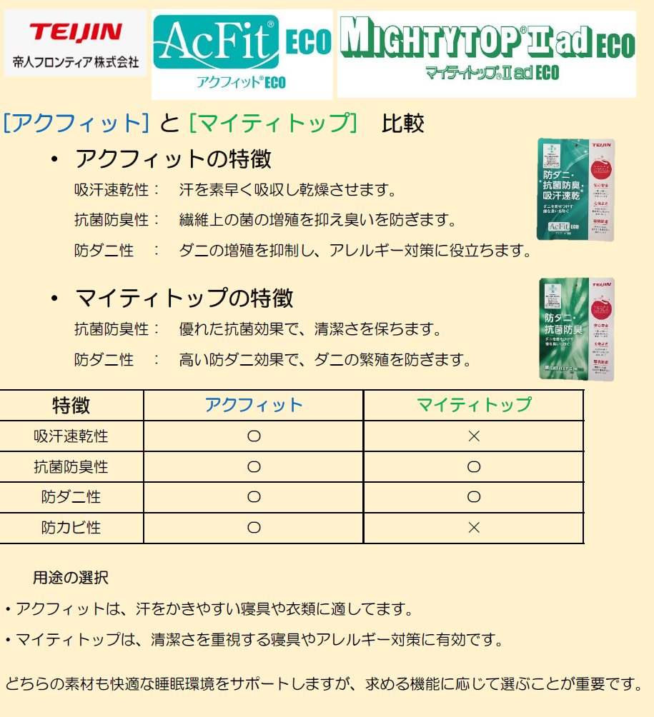 ・中綿をテイジンの「マイティトップ」・「アクフィット」